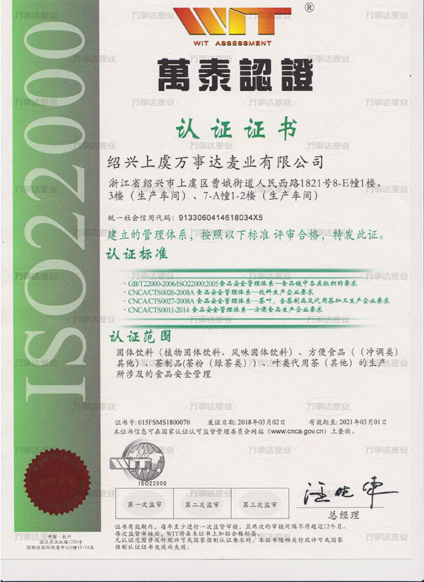 The scope of ISO22000 food safety management system certification of our company includes Food safety management in the production of solid beverage (plant solid beverage, flavored solid beverage), instant food (others), tea product (tea powder (green tea)), leaf substitute tea (others).